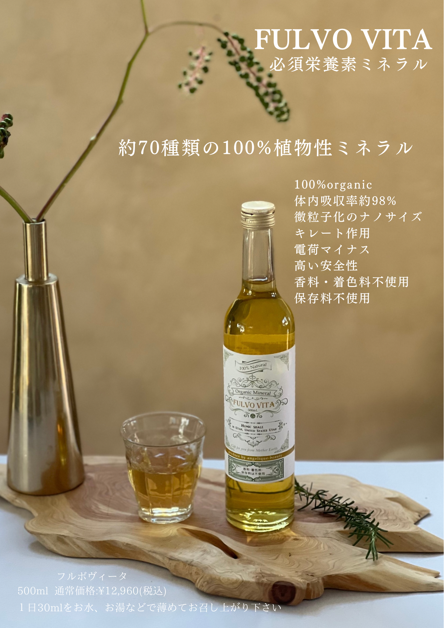 アメリカユタ州のヒューミックシェールから抽出した100%植物性フルボ酸、微粒子化されたナノサイズで約98%の体内吸収率をアップ、天然キレート剤で細胞の隅々まで届け有害ミネラルを排泄してくれます。